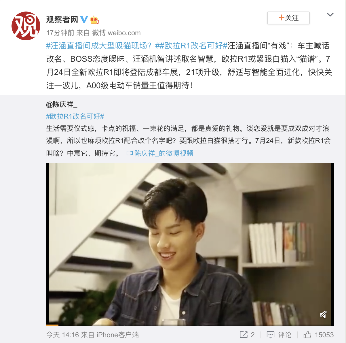 7月18日,汪涵在《向美好出发》直播间为长城欧拉带货,欧拉R1美女车主现场“吸猫”上头,被欧拉白猫的独特命名圈粉,随即微博发起话题#欧拉R1改名可好#,喊话欧拉官方求更名,掀起了一股全网“议更名”的讨论热潮。自更名话题上线以来,话题阅读量高达2573.6万,讨论次数多达8000次,持续“霸榜”微博车系热议TOP2,花式上演“欧拉R1更名热”。