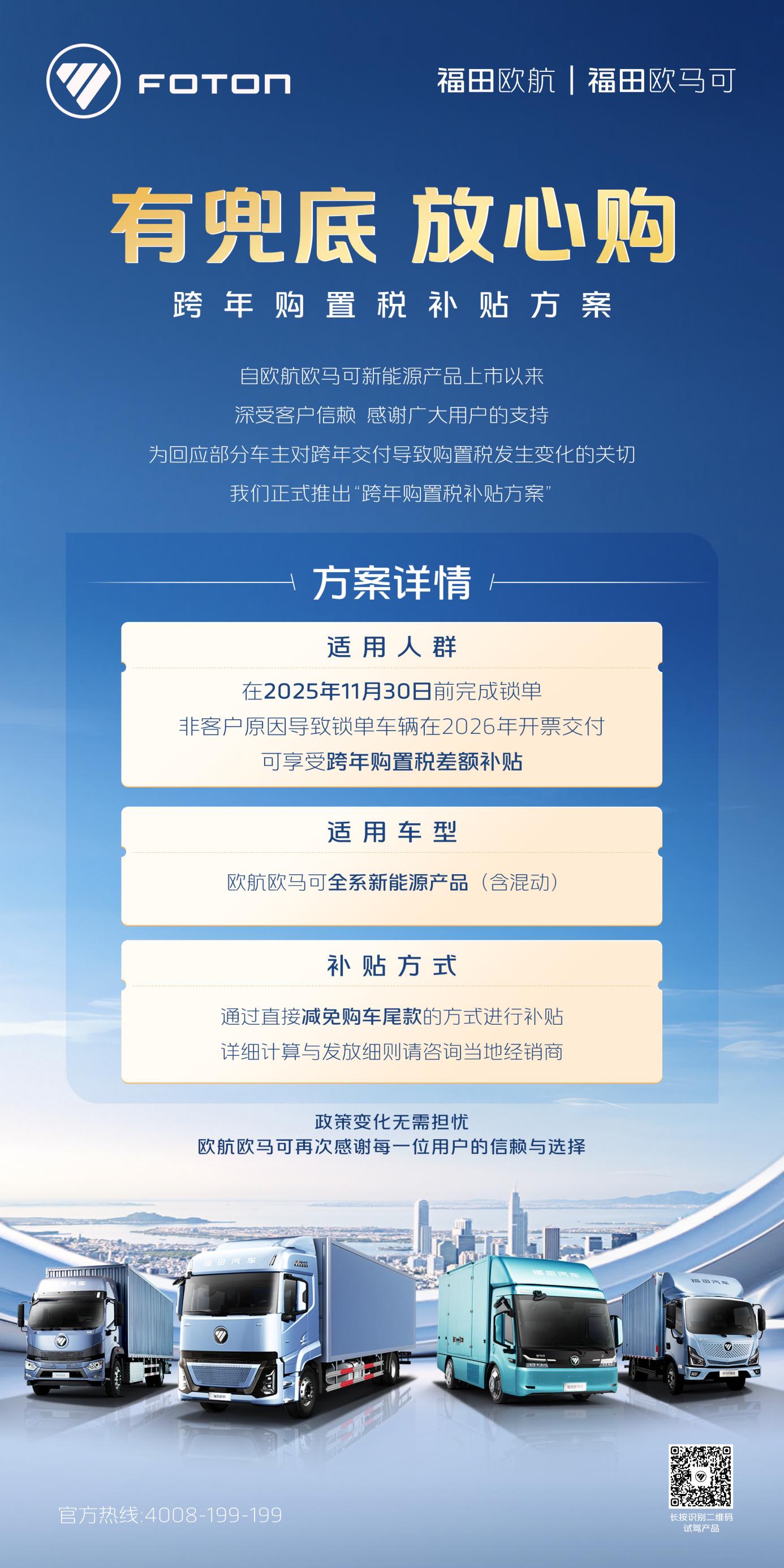 客户需在2025年11月30日24:00前,与福田公司或福田授权经销商签订购车合同并支付定金完成锁单,就有机会享受购置税差额补贴政策。当出现非客户原因导致该锁单车辆在2026年开票交付的情形时,客户可享受跨年购置税差额补贴,具体的补贴细则可咨询当地经销商。