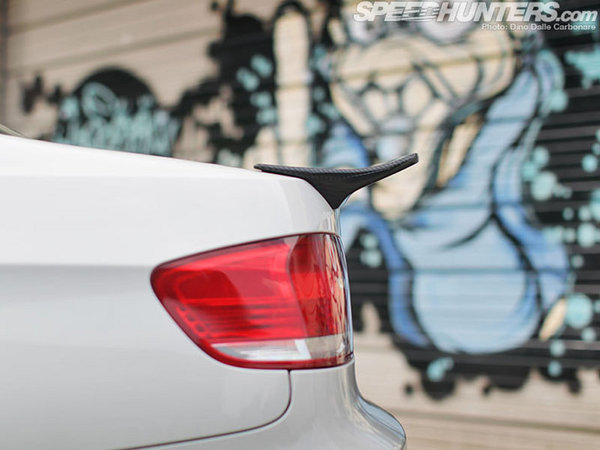 因为轮毂的加宽,使整车看起来霸气非凡。还有就是加装的碳纤维运动套件与尾部的碳纤维扰流板,更是起到了画龙点睛的作用,让我们看出车主在细节部位的处理是多么的认真与细腻。