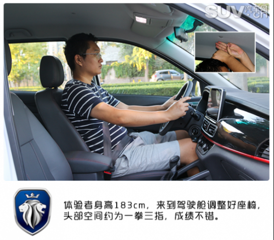 体验者身高183cm,来到驾驶舱调整好座椅,头部空间约为一拳三指,成绩不错。